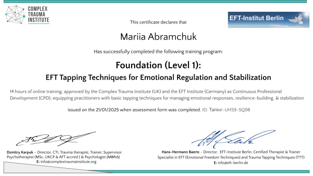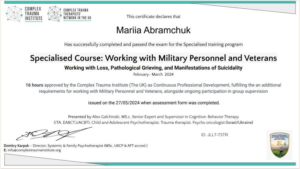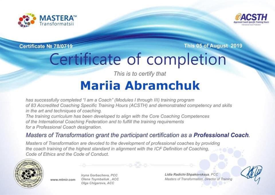 "Вітаю, мене звуть Марія Абрамчук, я професійний психолог і сертифікований Коуч.