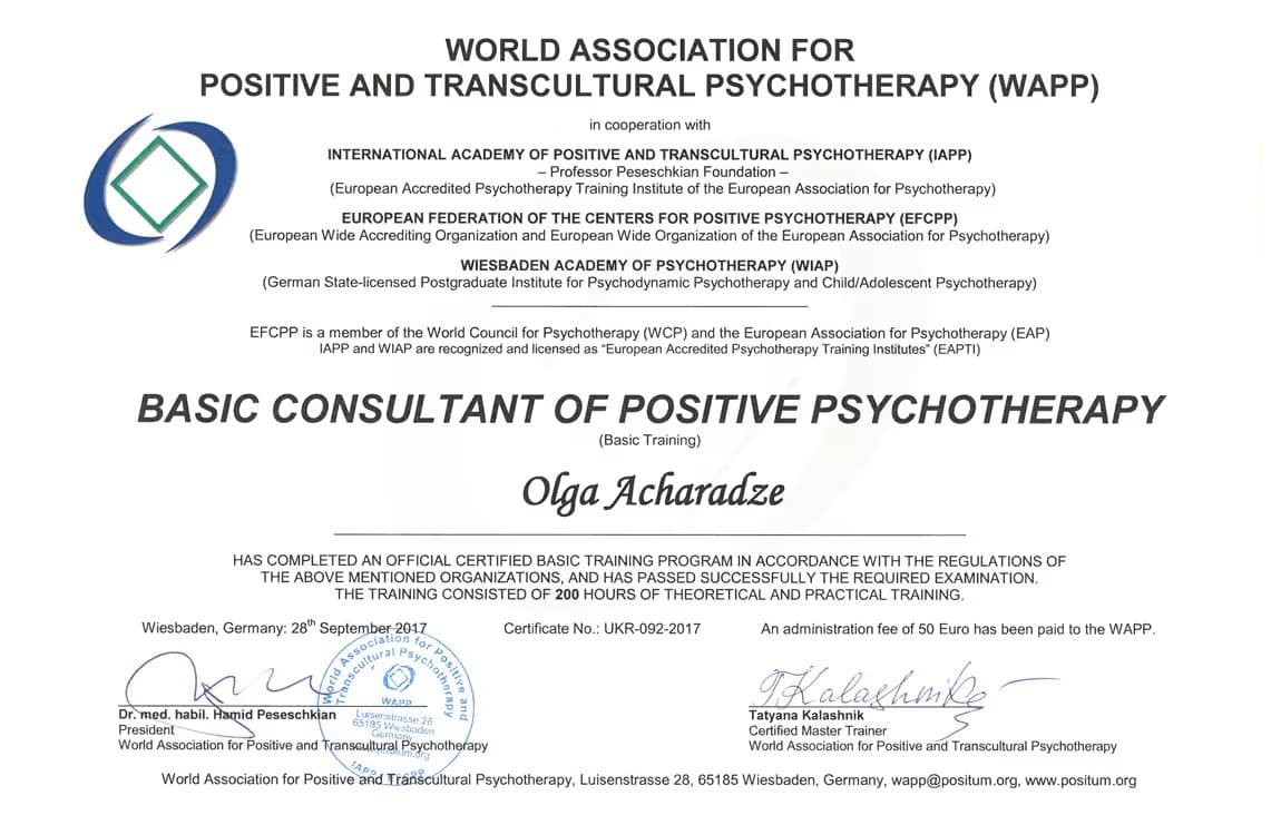 "Вітаю, мене звати Ольга Ачарадзе, я консультуючий психолог, психосоматолог.