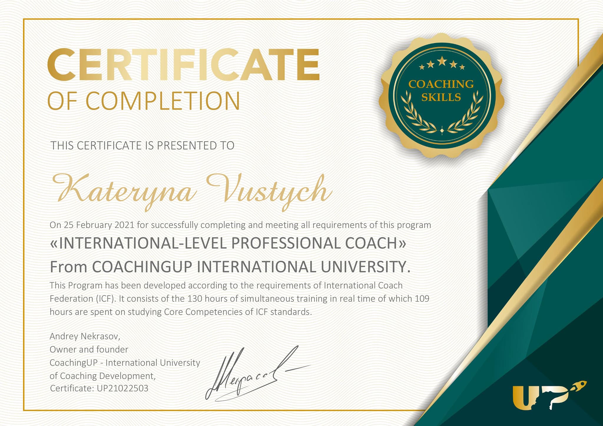 "Вітаю, мене звати Катерина Вустич, сертифікований коуч ICF. Я сприяю реалізації людського потенціалу на максимум шляхом створення результатів та відносин.