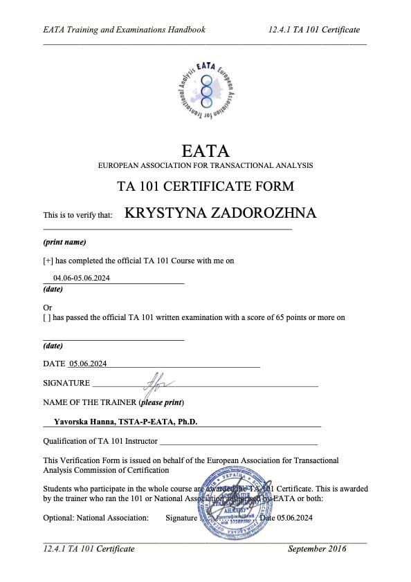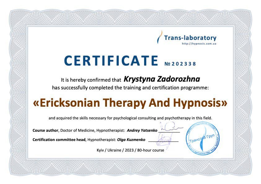 Я практикуючий психолог, досвід роботи 6 років. Працюю з дорослими, сімейними парами. Проводжу індивідуальні терапевтичні сесії та психологічні консультації."