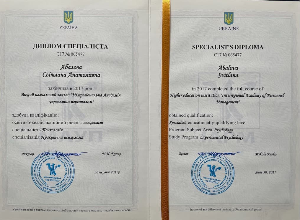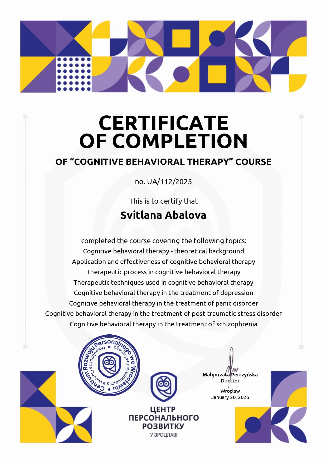 У роботі керуюся методами КПТ, психоаналізу, а також використовую практики інших методів терапії залежно від ситуації та стану клієнта. Практикую застосування метафоричних асоціативних карт, як метод арт-терапії."