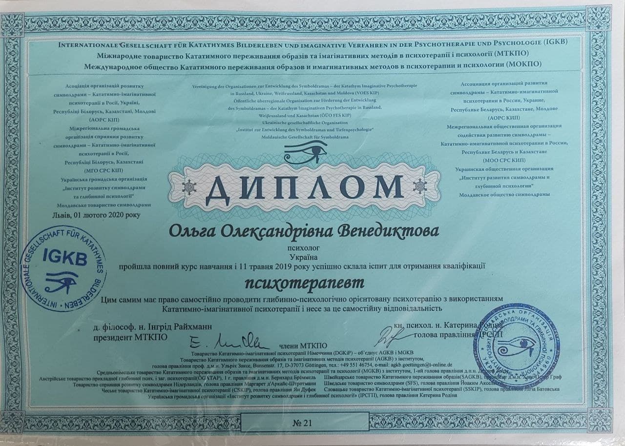 "Вітаю, мене звуть Ольга Венедиктова, я сертифікований психотерапевт у методі символдрама, і вже досить тривалий час ефективно працюю з дорослими, дітьми з 10 років та підлітками.
