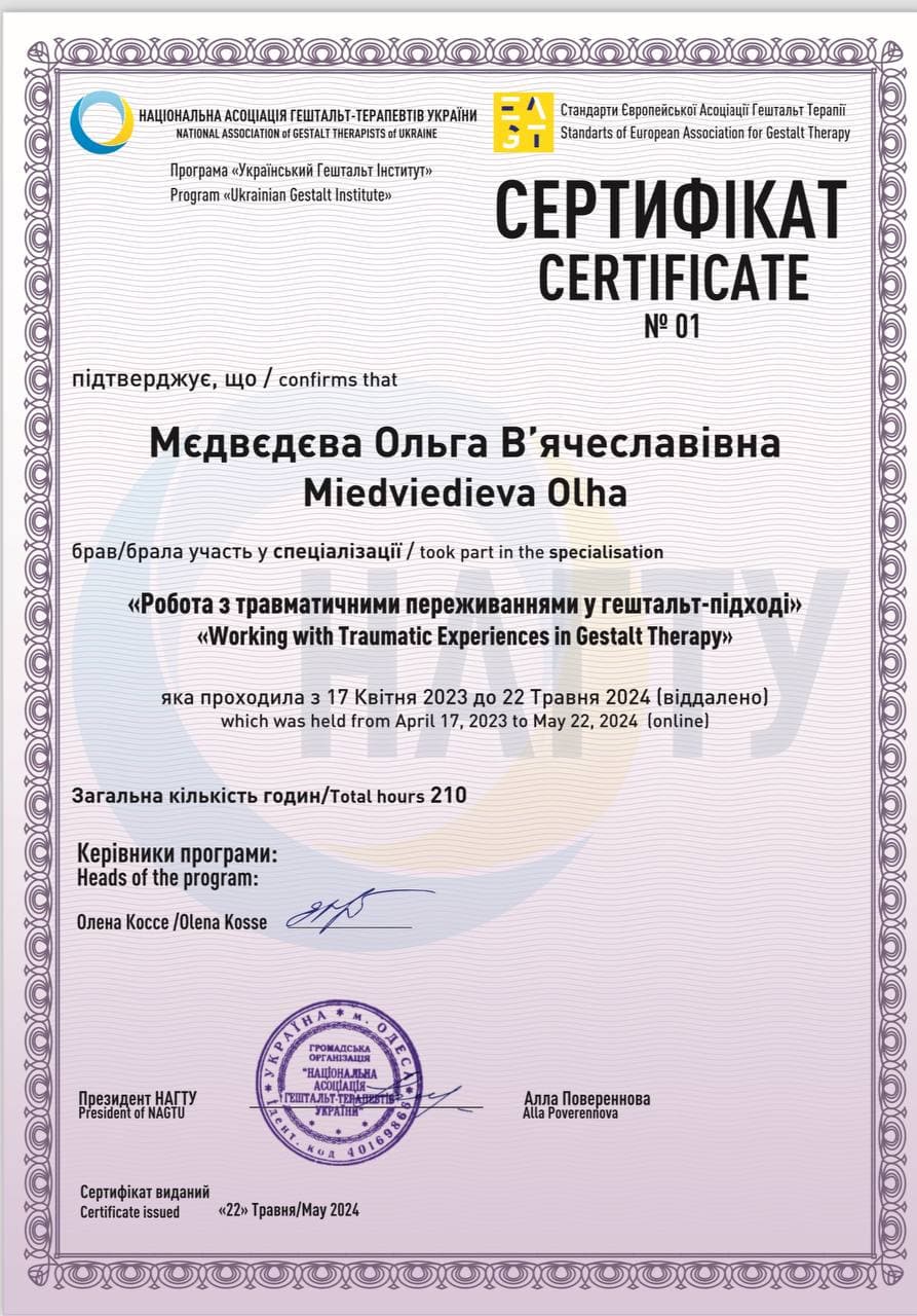 "Вітаю, мене звуть Ольга Мєдвєдєва, і я практична психологиня та психотерапевтка.