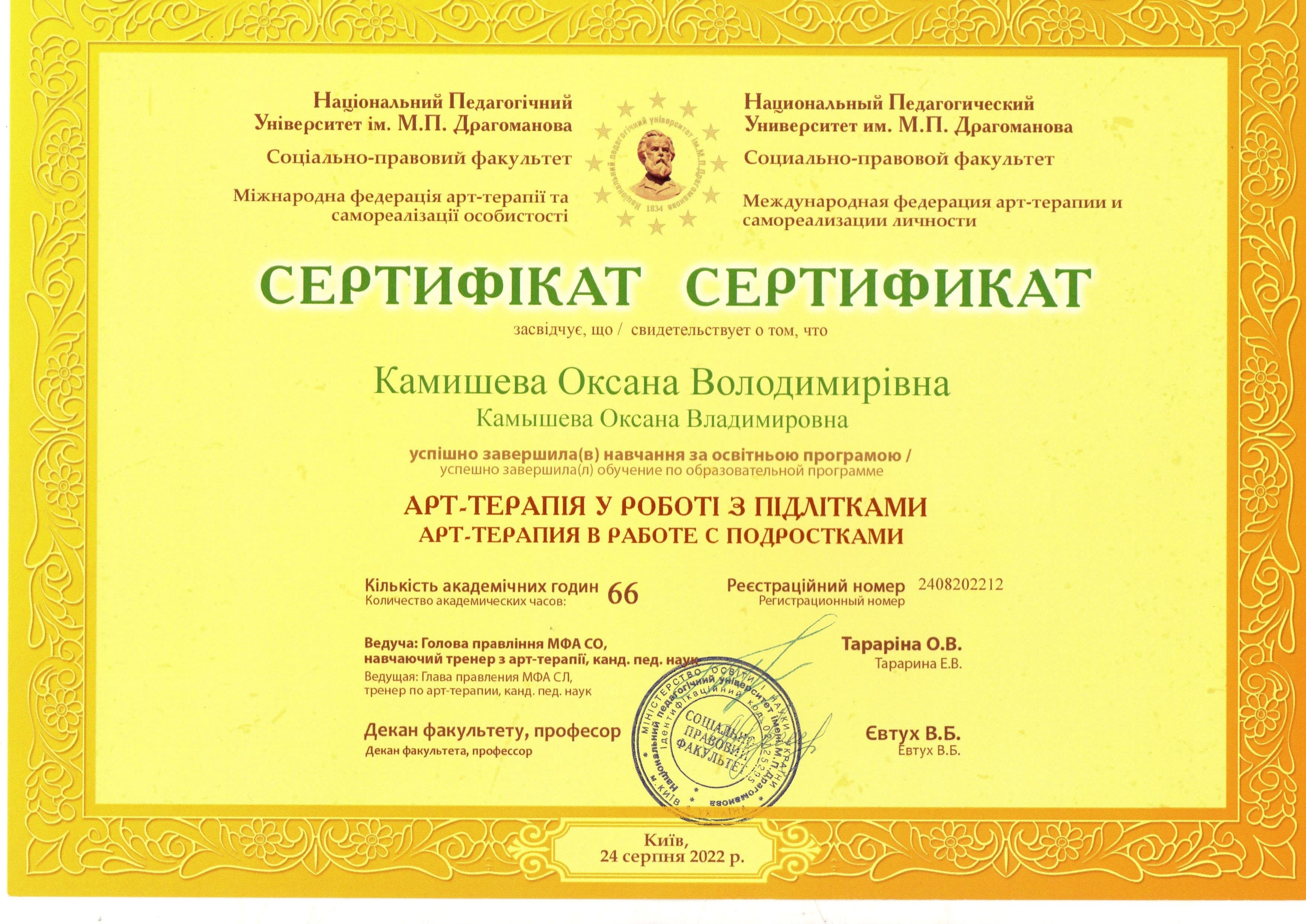 "Вітаю, мене звати Оксана Камишева, я практичний психолог, медіатор, арт-терапевт та консонанс терапевт у навчанні.