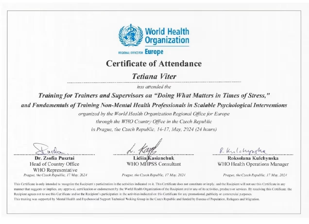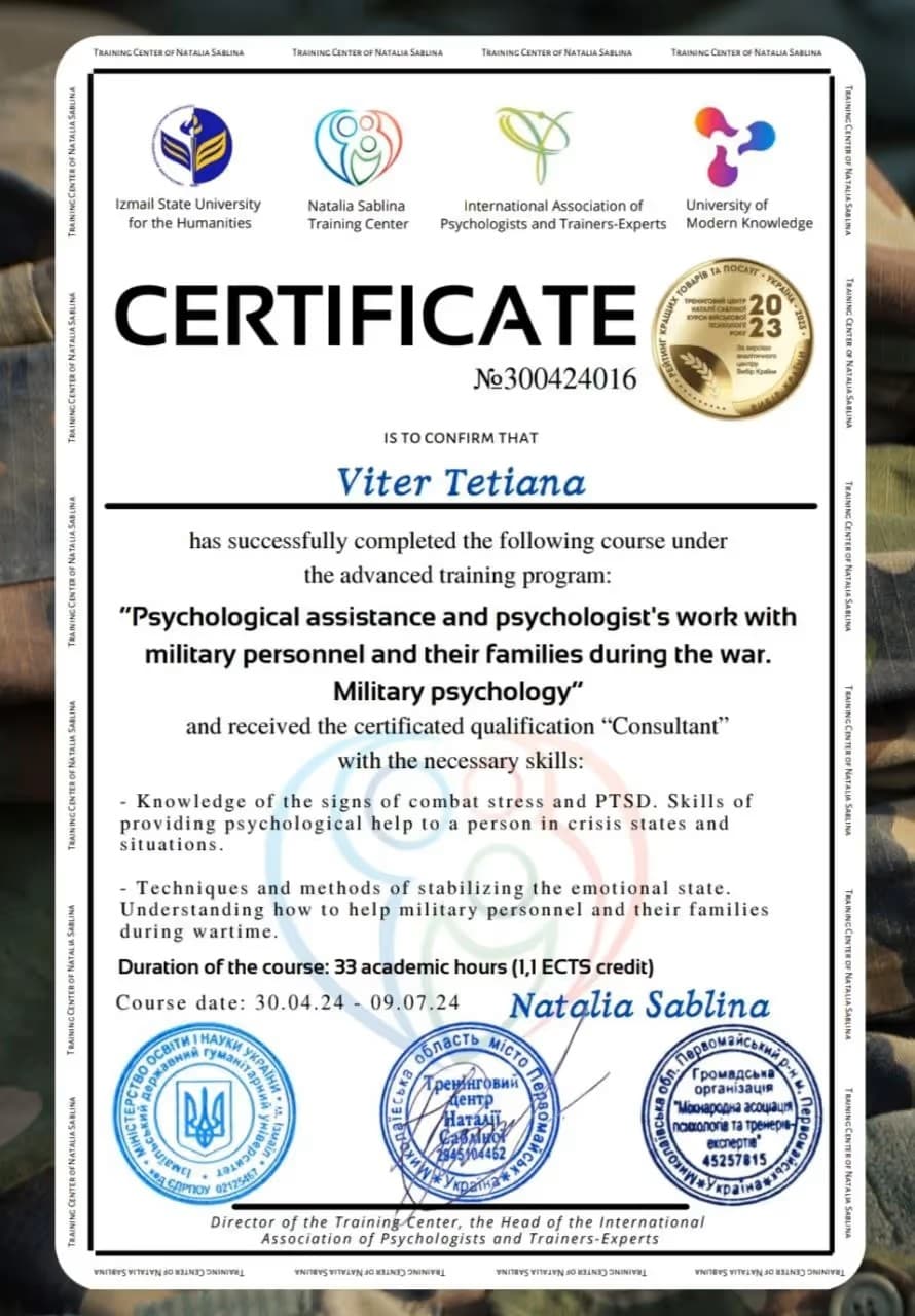 Я психологиня. Провожу індивідуальну та групову терапію. Консультую дорослих, сімейні пари, жінок-переселенок.