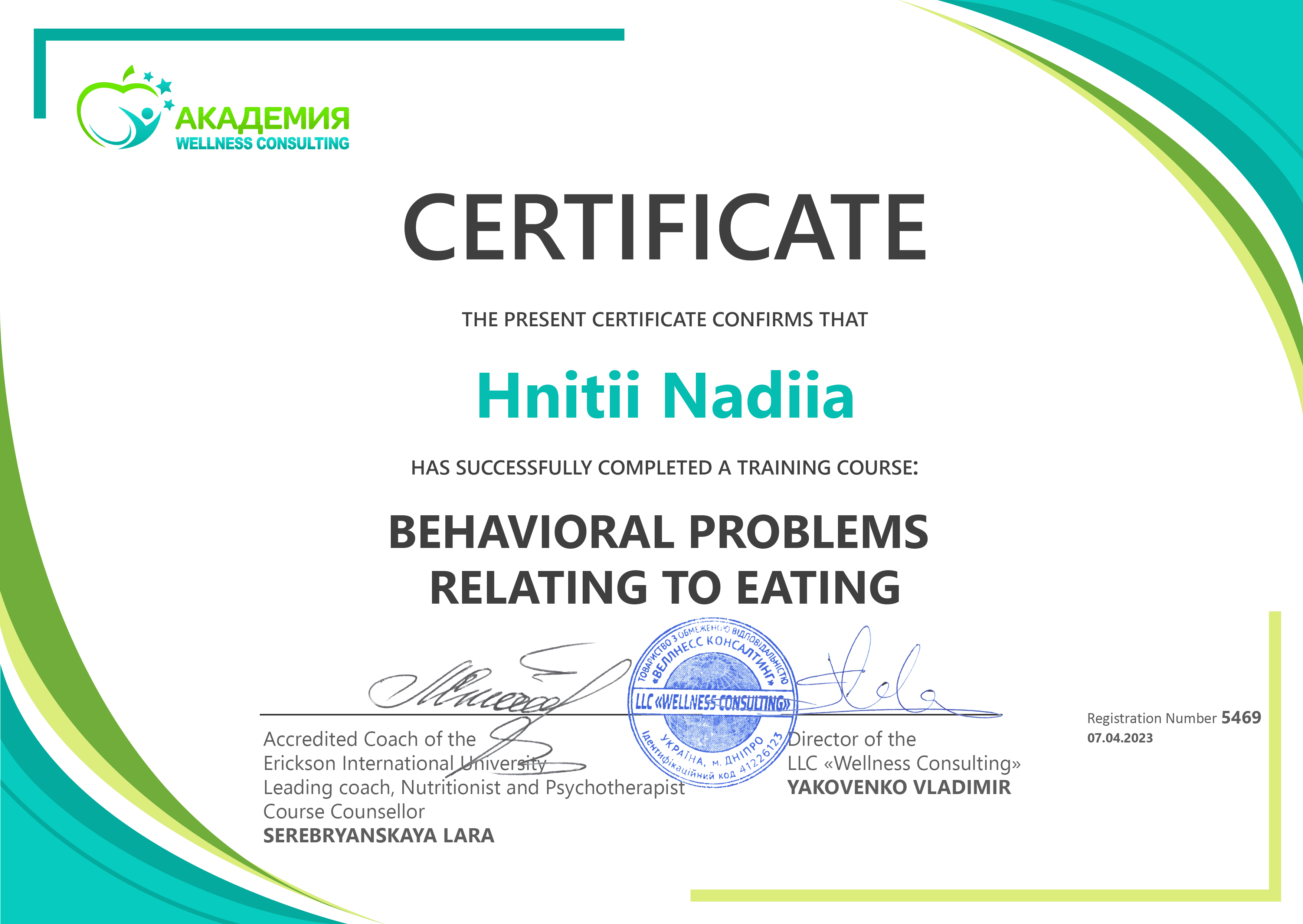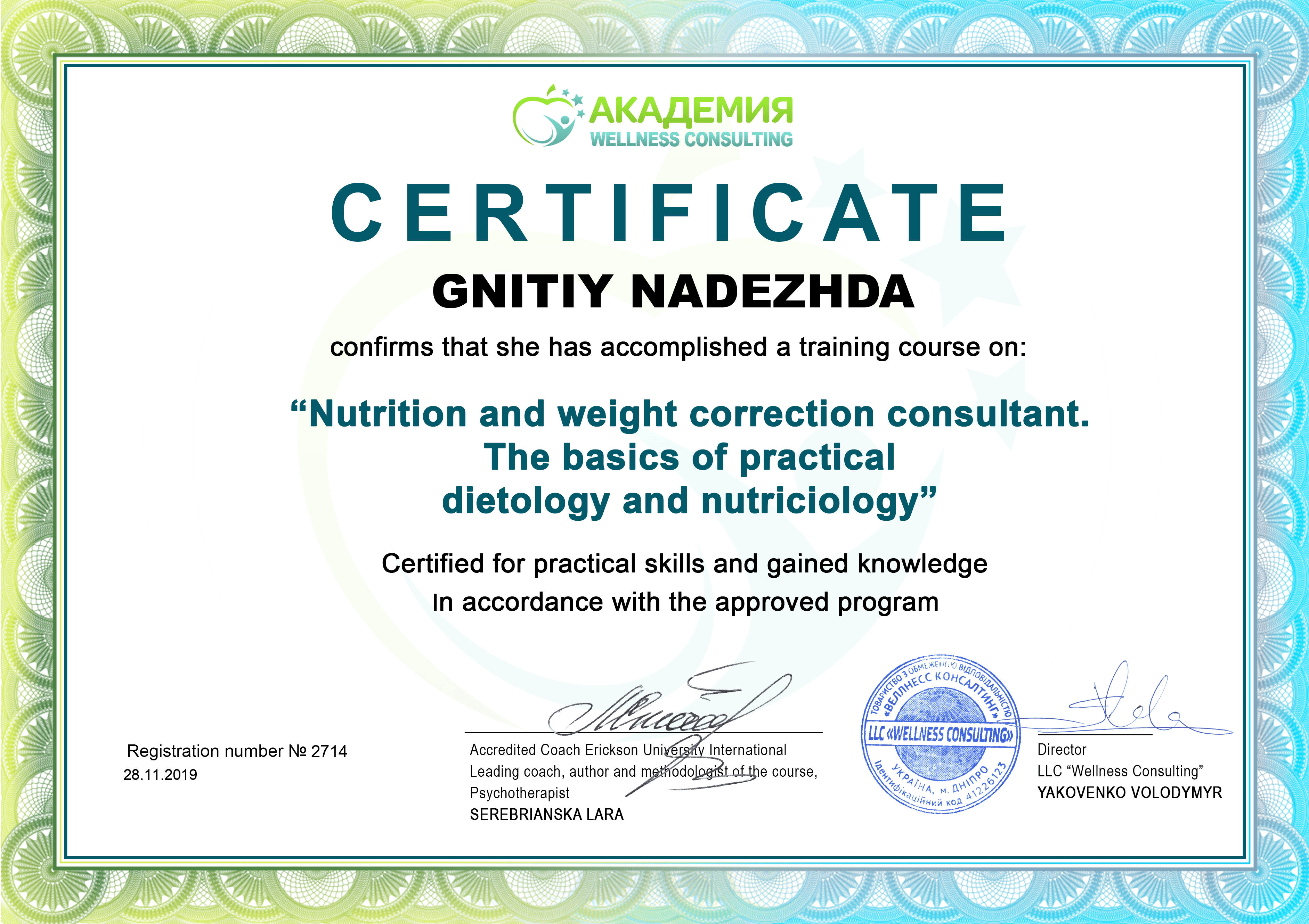 Мене звуть Надія Гнітій, і я — сертифікований сімейний превентивний нутриціолог, Health-coach, тренер зі здорових звичок та омолодження, з вищою хімічною та біологічною освітою, викладач декількох університетів.