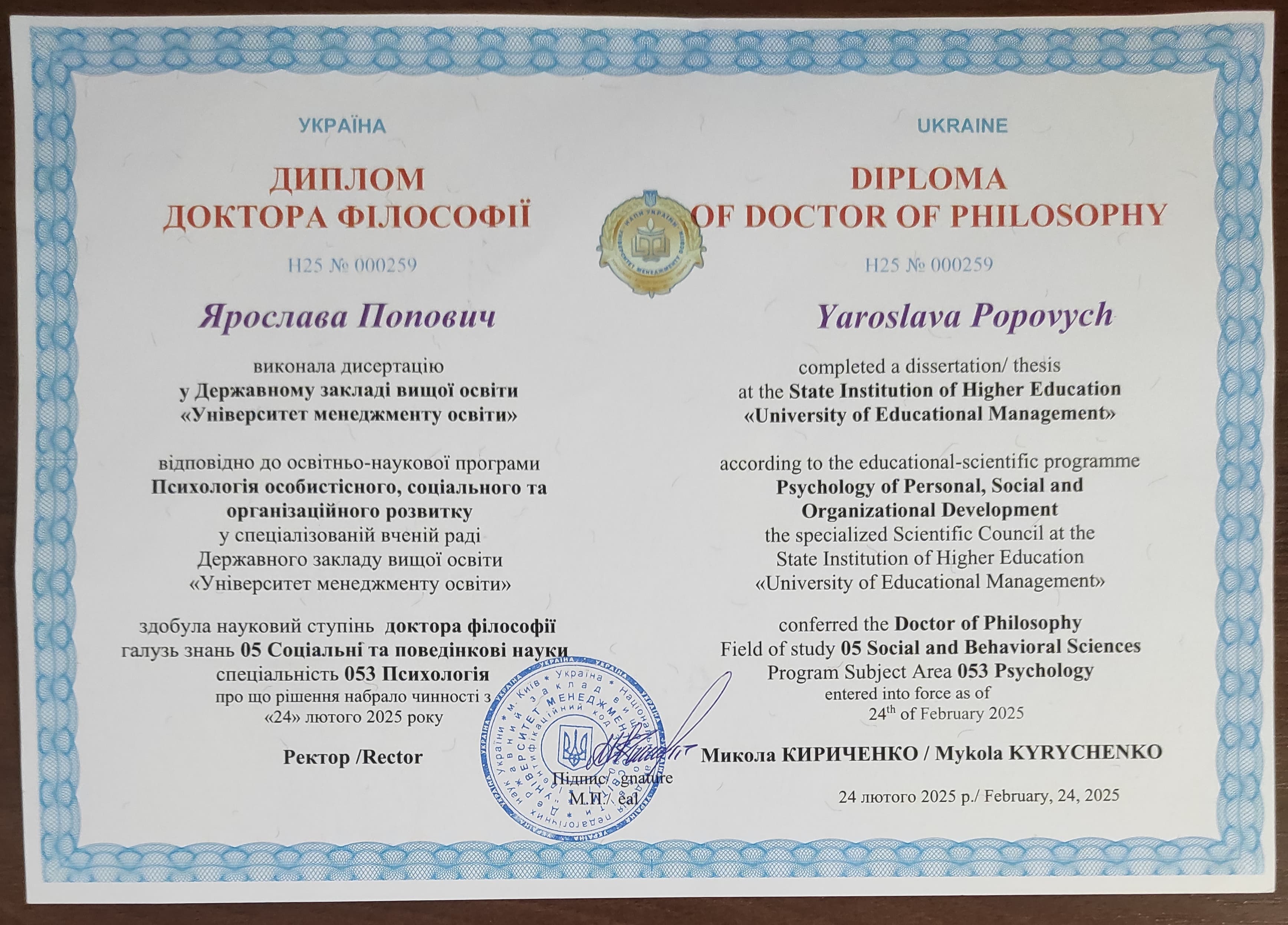 2025 - Державний заклад вищої освіти “Університет менеджменту освіти”. Освітньо-наукова програма Психологія особистісного, соціального та організаційного розвитку. Науковий ступінь доктора философії галузь 05 Соціальні та поведінкові науки спеціальність 053 Психологія.