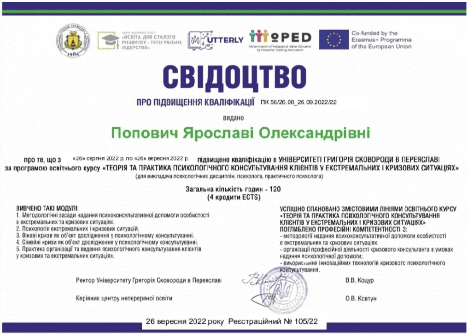 2022 – Університет Григорія Сковороди в Переяславі. Підвищення кваліфікації за програмою курсу «Теорія та практика психологічного консультування клієнтів у екстремальних і кризових ситуаціях».