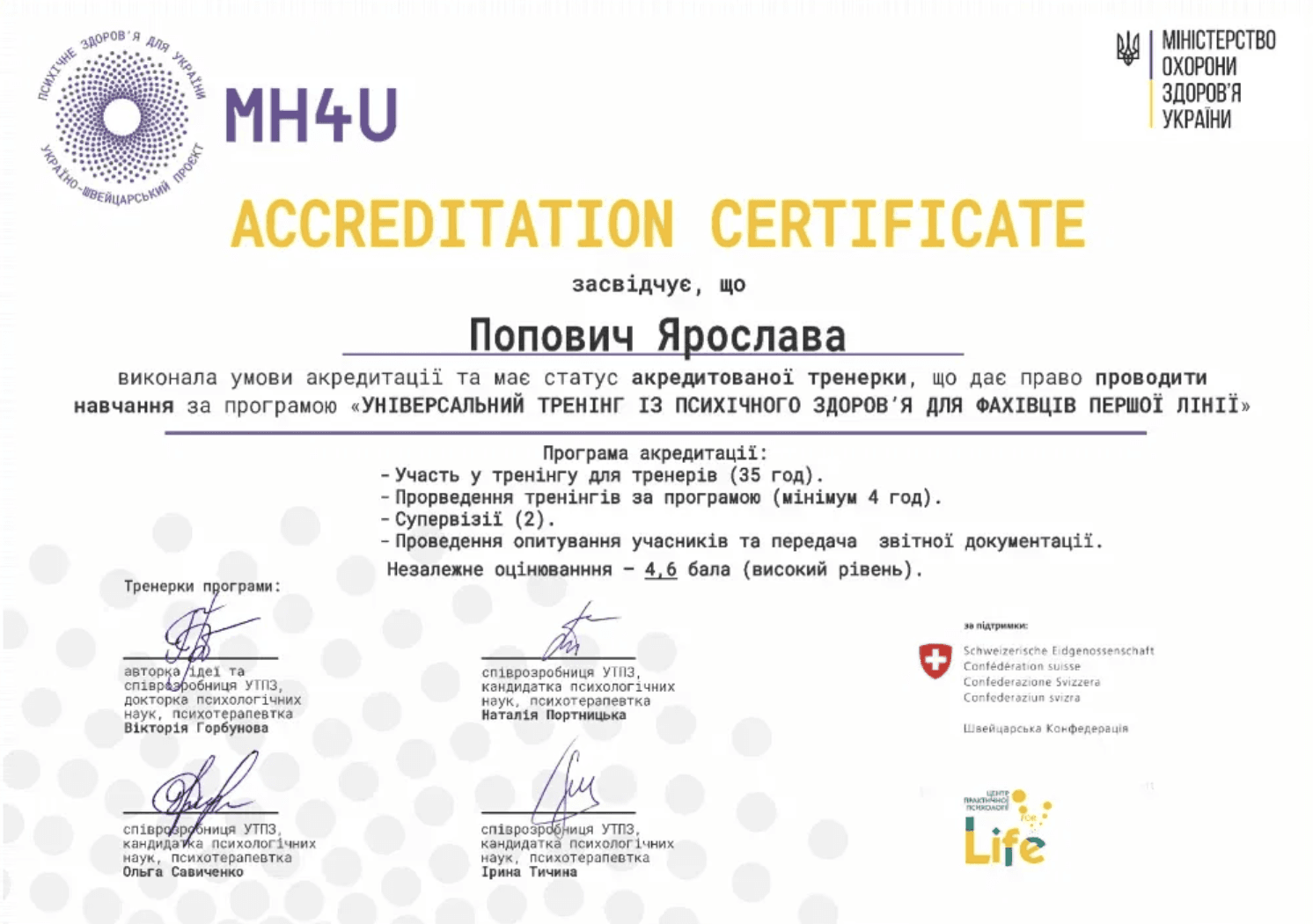 2023 – Україно-Швейцарський проєкт «Психічне здоров’я для України» (MH4U) у співпраці з Міністерство охорони здоров’я України. Тренінг для тренерів за програмою «Універсальний тренінг із психічного здоров’я для фахівців першої лінії». Статус – акредитована тренерка проєкту Mental Health for Ukraine — MH4U.