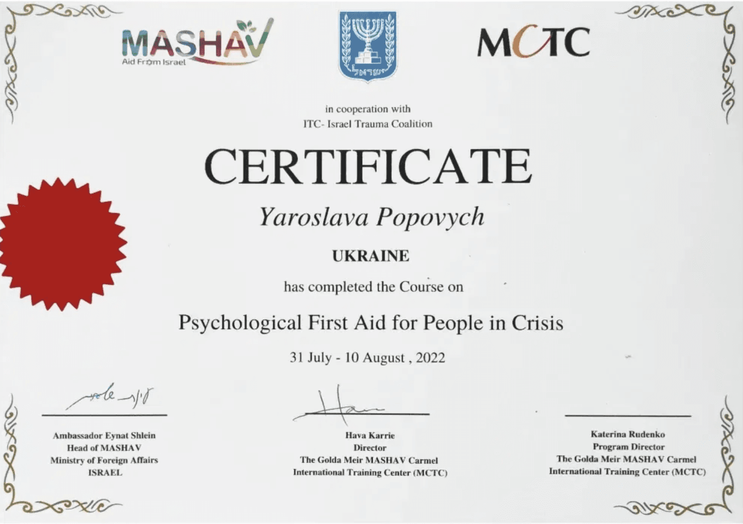 2022 – Ізраїль. ITC Israel Trauma Coalition, MASHAV Carmel Internatoinal Training Center. Психологічна допомога людям у кризовому стані.
