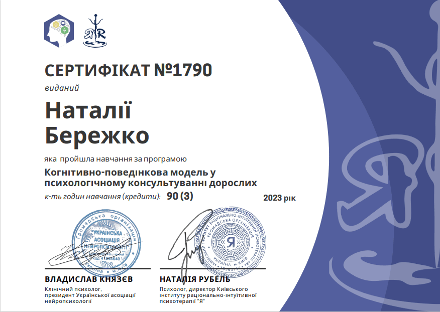 Також маю приватну практику. Я постійно навчаюсь, тому зараз я психотерапевт, який практикує в трьох методах. Метод Когнітивно-поведінкової терапії я використовую тому, що він допомагає подоланню труднощів людини «тут і зараз» за допомогою простих практичних вправ, орієнтованих на усвідомлення власних емоцій, думок і поведінки.